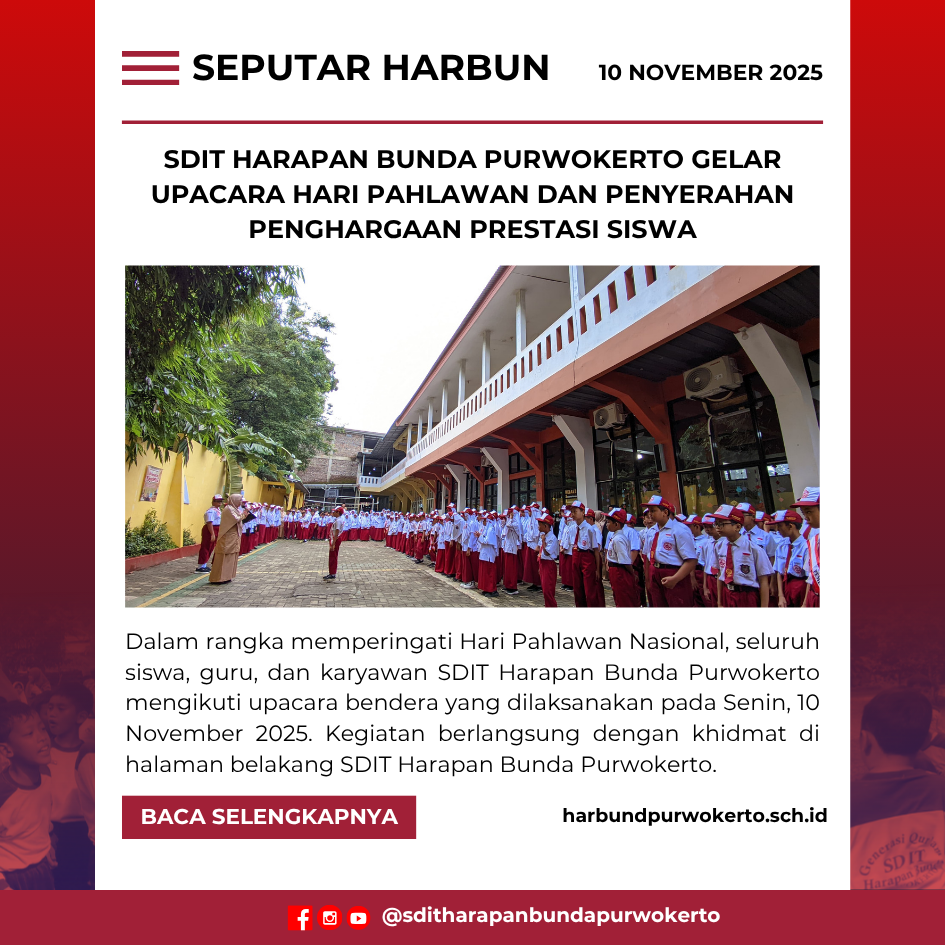 Dalam rangka memperingati Hari Pahlawan Nasional, seluruh siswa, guru, dan karyawan SDIT Harapan Bunda Purwokerto mengikuti upacara bendera yang dilaksanakan pada Senin, 10 November 2025. Kegiatan berlangsung dengan khidmat di halaman belakang SDIT Harapan Bunda Purwokerto.
